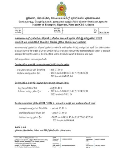 මේ සම්බන්ධයෙන් ප්රවාහන, මහා මාර්ග, වරාය සහ සිවිල් ගුවන් සේවා අමාත්යංශය විසින් නිවේදනයක් නිකුත් කර ඇත.