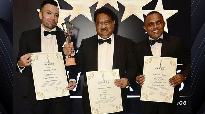 නුවරඑළියේ සුව පහසු හෝටලයක් වන The Golden Ridge හෝටලය World Luxury Awards 2025 සම්මාන උළෙලේදී සම්මාන ත්රිත්වයක් දිනා තිබේ. ගෝලීය වශයෙන් පිළිගත් එම සම්මාන උළෙල සිංගප්පූරුවේ PARKROYAL Hotel Pickeringහිදී පැවැත්විණි. ගෝලීය ජයග්රාහකයා – සුඛෝපභෝගී කඳුකර හෝටලය, නිරිතදිග ආසියානු ජයග්රාහකයා – සුඛෝපභෝගී නවීන හෝටලය, නිරිතදිග ආසියානු ජයග්රාහකයා – සුඛෝපභෝගී කඳුකර හෝටලය එම සම්මාන ත්රිත්වය වේ. මුහුදු මට්ටමේ සිට අඩි 7,339ක උසින් පිහිටි මෙරට උසින් වැඩිම නගරයේ පිහිටි The Golden Ridge වෙත පැමිණෙන අමුත්තන්ට විශිෂ්ට ආගන්තුක සත්කාර සහ සේවා සමග ඉතා උසස් නේවාසික අත්දැකීමක් ලැබිය හැකිය. අක්කර 5ක භූමි භාගයක් පුරා පැතිරී ඇති එම හෝටලය Deluxe, Deluxe Quadruple, Family Rooms, Junior Suites, Mountain View Suites යන ඛාණ්ඩවලට අයත් සුව පහසු කාමර 84කින් සමන්විත වේ.